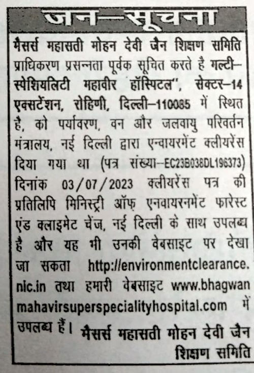 The Advertisement for Accreditation of Environmental Clearance 907 vide ECI No. EC23B038DL196373 dated 03.07.2023 from Ministry of Environment, Forest and Climate Change Delhi: in the Newspapers at: 16.10.2025